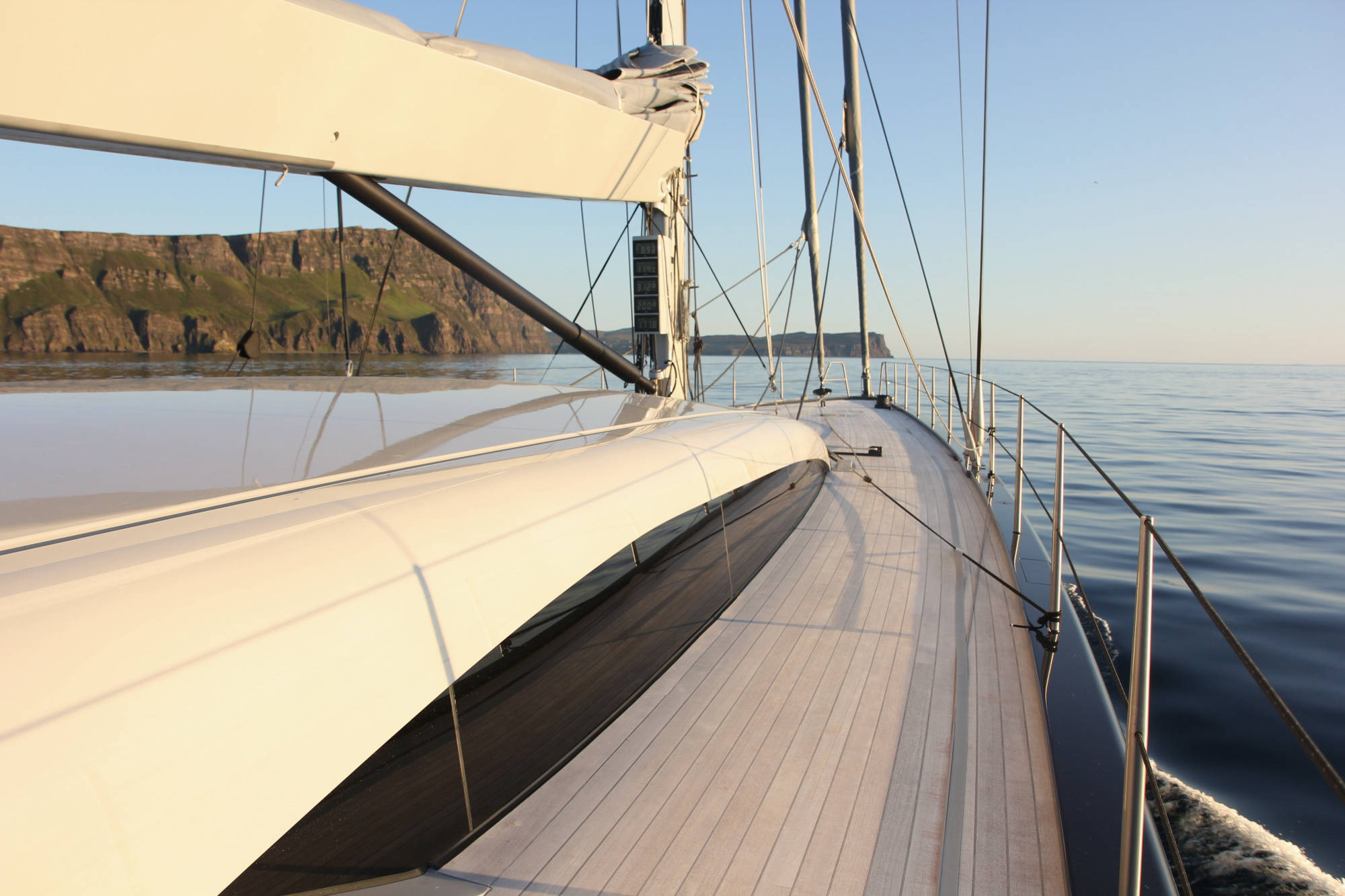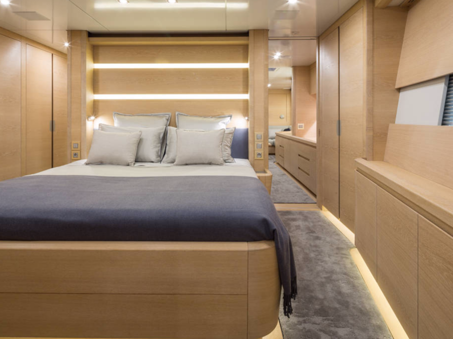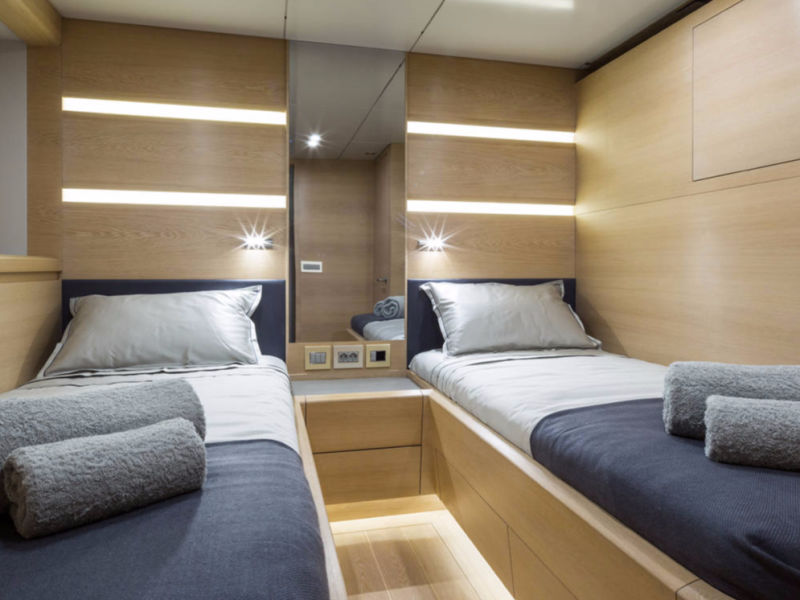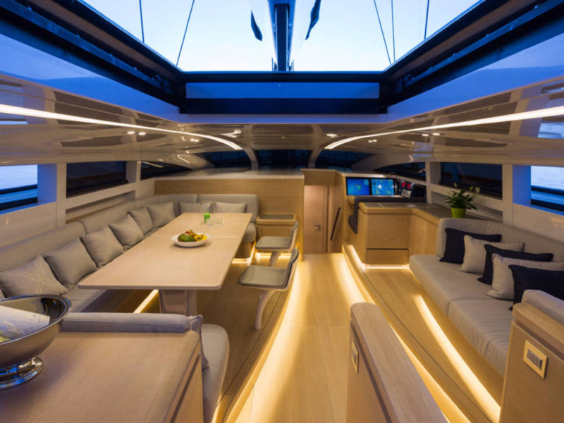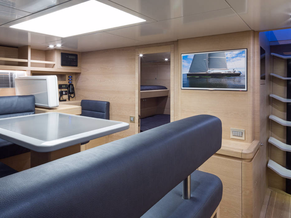 Baltic 108 WinWin is built using pre-preg carbon with a foam core. Her modern, functional interior features bleached oak panels.